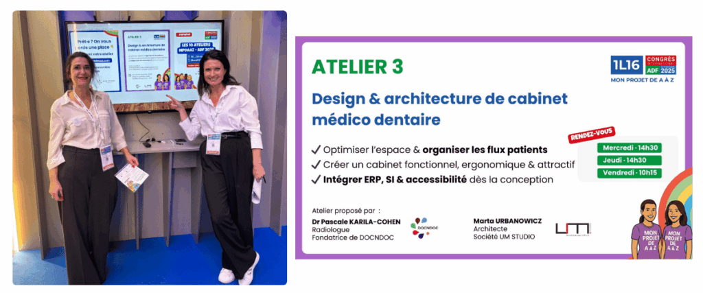 Fin novembre, DOCNDOC a participé au Congrès ADF aux côtés de ” Mon Projet de A à Z “. Sur le stand MPDAAZ, le Dr Pascale Karila-Cohen et l’architecte Marta Urbanowicz (UM Studio) ont animé un atelier dédié à la conception et à l’aménagement de cabinets médico-dentaires. L’objectif : offrir des clés pratiques pour créer des espaces de soin efficaces, ergonomiques et durables.